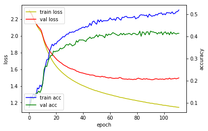 val_loss 값이 감소되다가 증가하자마자 학습이 종료되어서 실상은 더 학습될 수 있는데 accuracy가 42%밖에 안된 시점에 early stopping된 것을 볼 수 있다. 이럴 경우 patience 인자를 증가해서 성급한 조기종료가 되지 않도록 해야한다.