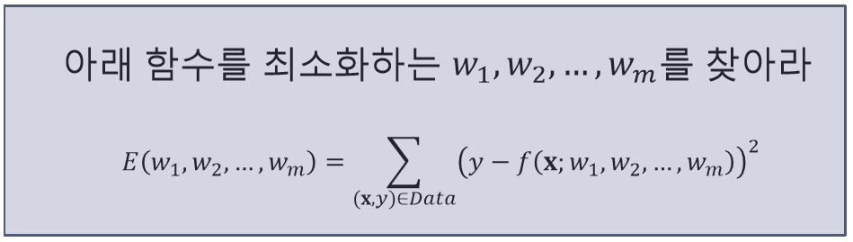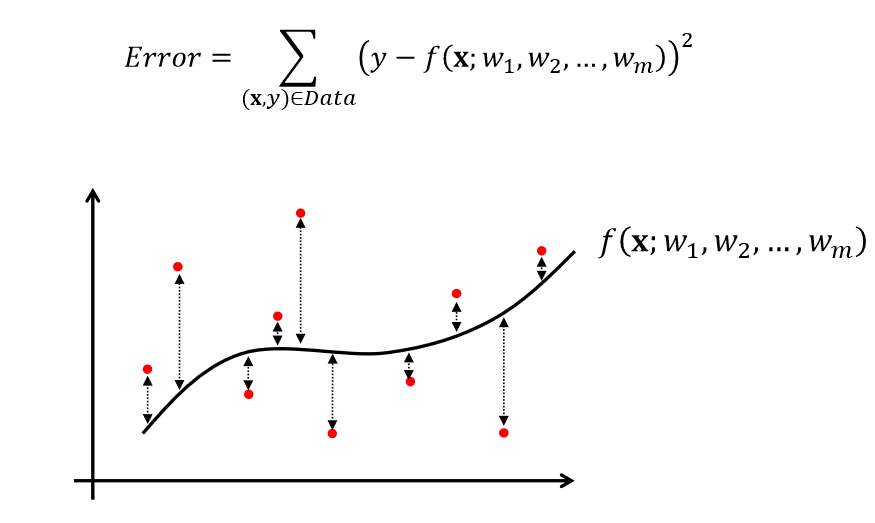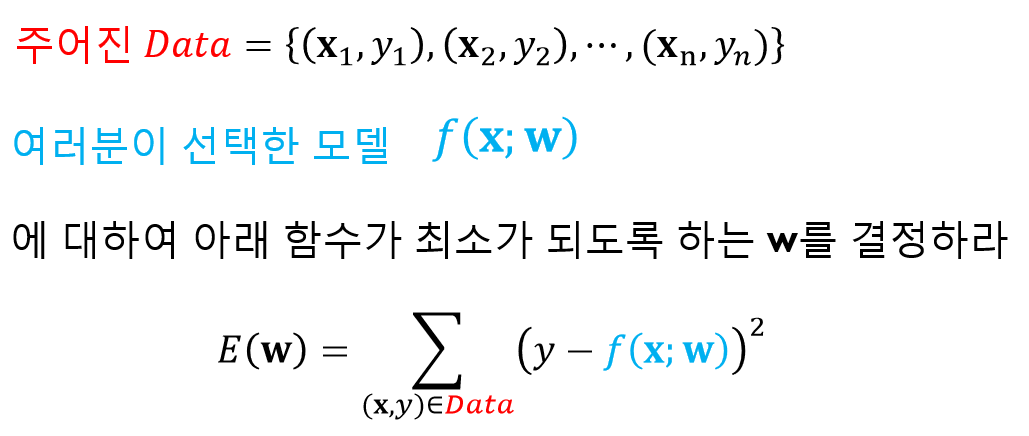 즉, "주어진 데이터를 가장 잘 설명하는 함수를 찾아라"라는 문제는 아래 문제로 변환될 수 있다. ( 아래는 Error 계산 시 MSE 방법을 사용했을 때이다. 이 Error 함수를 Loss 함수라고도 하며 다르게 정의될 수 있다. )