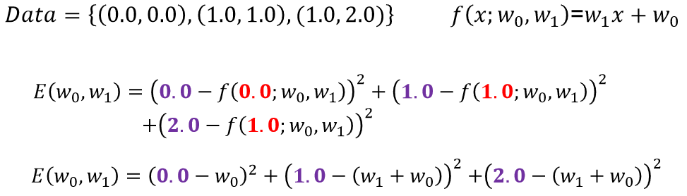 먼저 "데이터를 가장 잘 설명"한다는 것은 주어진 데이터와 오류를 최소화하는 함수를 찾는 다는 것으로 이해할 수 있다.여기서 또 오류란? 주어진 좌표와 함수와의 거리를 계산한다고 생각할 수 있는데 거리를 y-f(x)의 제곱으로 계산한다 했을 때, 아래와 같이 계산될 수 있다.