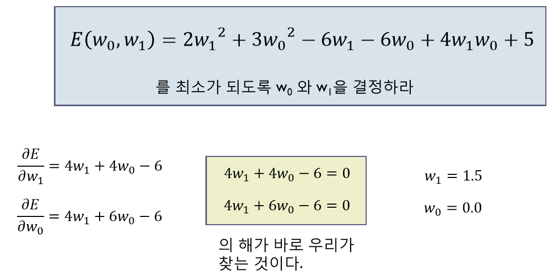 그럼 이제 어떻게? E를 w 들에 대해 편미분을 하고 0으로 만드는 w를 찾으면 되겠다. (극점을 찾는 방법 -> 기울기가 0이 되는 점 -> 기울기계산은 편미분을 하면! )